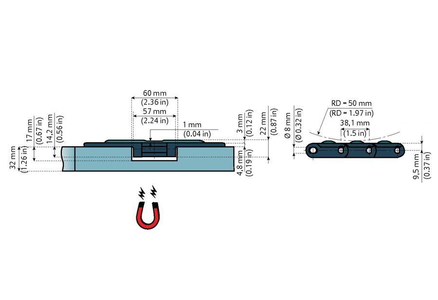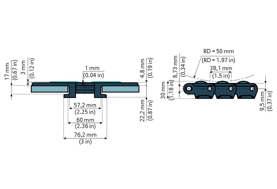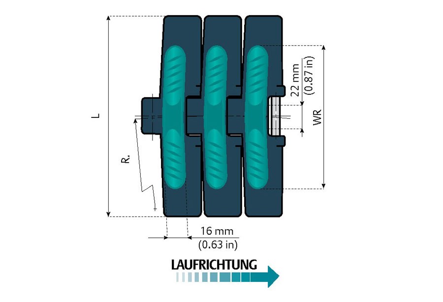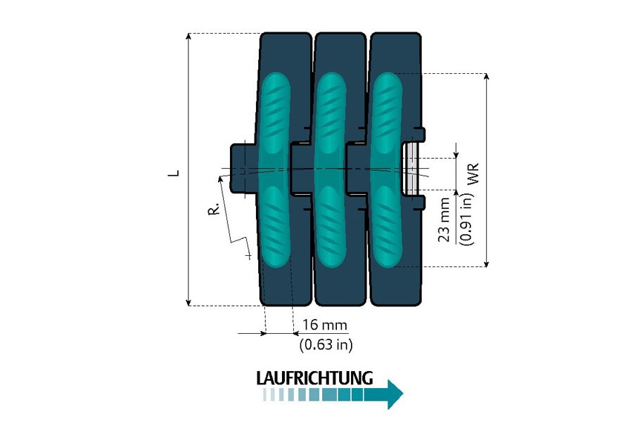 | Artikelbezeichnung | Material Plate | Material Rubber | Breaking load N | Breaking load lbs | Breite L mm | Breite L Zoll | Width WR mm | Width WR Zoll | R min. mm | R min. Zoll | Gewicht Kg/m | Gewicht lbs/ft. |