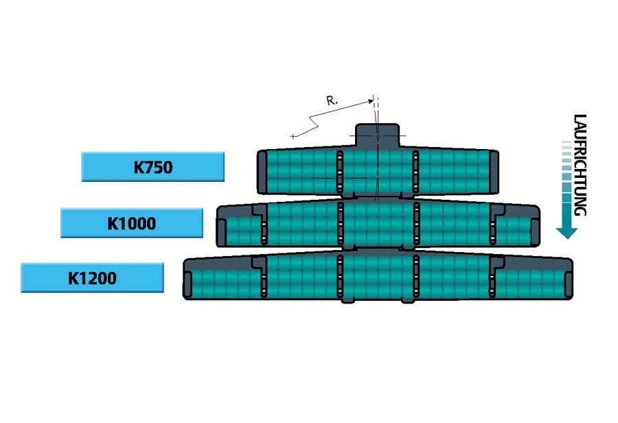 | Artikelbezeichnung | Material Platten | Material Rollen | Bruchlast N | Bruchlast lbs | Breite L mm | Breite L Zoll | R min. mm | R min. Zoll | Gewicht Kg/m | Gewicht lbs/ft. |