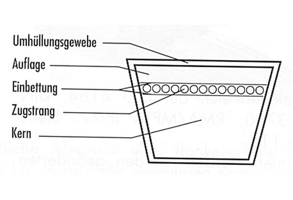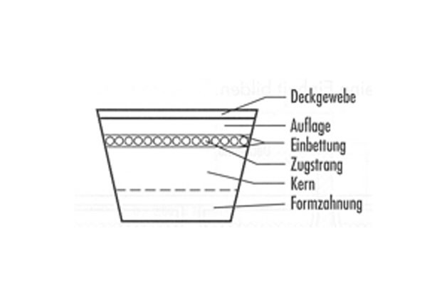 | DIN 2215 Li | Länge mm length Li | Querschnitt b x h cross section W x H | Winkel angle | Gewicht weight kg/m | Vmax belt speed m/s | fb max bending frequency 1/s | dw min min. pulley diameter mm | Temperatur- bereich temperature range C° | Anzahl der Zugstränge number of cord cables |