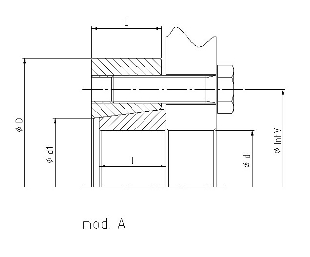 | d mm | D mm | L mm | IntV mm | l mm | d1 mm | c mm | d2 mm | Drehmoment Nm | N° | Schrauben DIN 912 Typ | Schrauben DIN 912 Anzugsmoment Nm | Kg. |