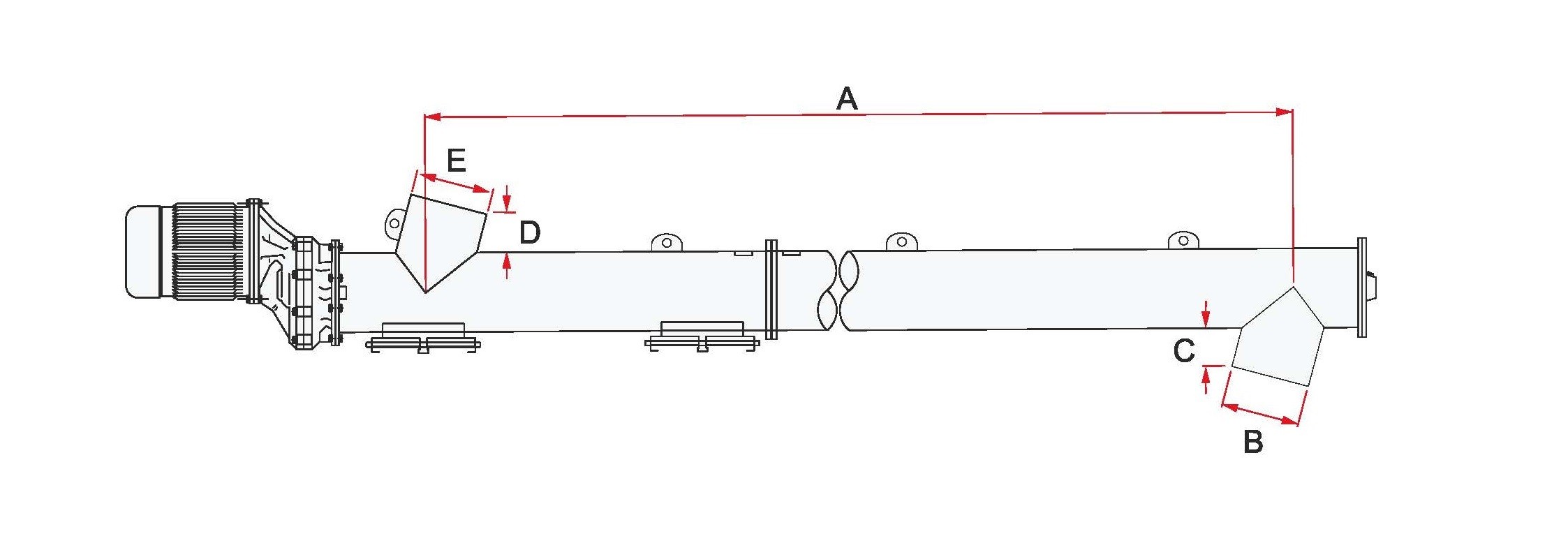 Die Dimensionen E und B (Durchmesser von Ein- und Auslauf) entsprechen dem Durchmesser vom Außenrohr der Schnecke. A, C und D können individuell gewählt werden.
