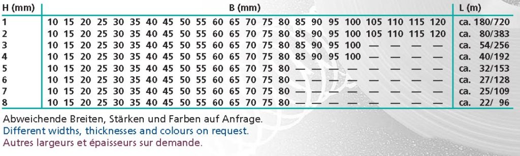 In unserem Sortiment finden Sie Bandmaterial und selbstklebendes Bandmaterial in verschiedenen Breiten bzw. Längen.