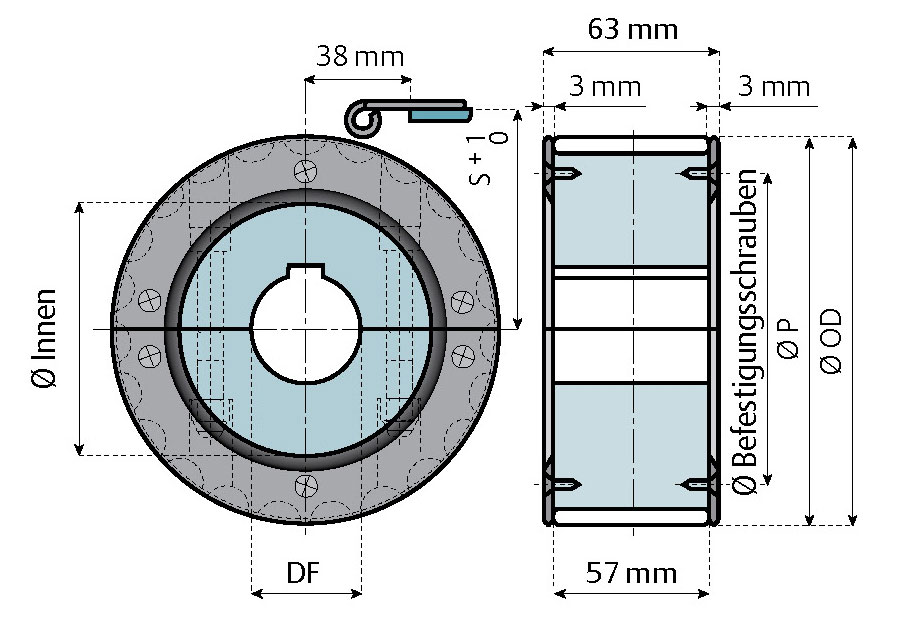 Material: Polyamid, Schrauben aus rostfreiem Stahl, Muttern aus verzinktem Stahl, DIN 6885 Passfeder