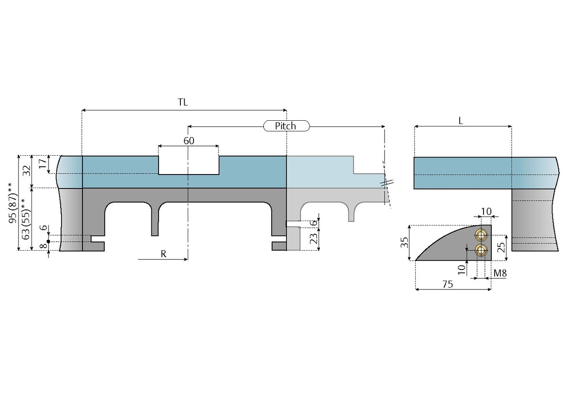 | Anzahl d. Spuren | TL | Typ der Kurve | R | L | Teilung | 30° Artikelbezeichnung | 45° Artikelbezeichnung | 90° Artikelbezeichnung |