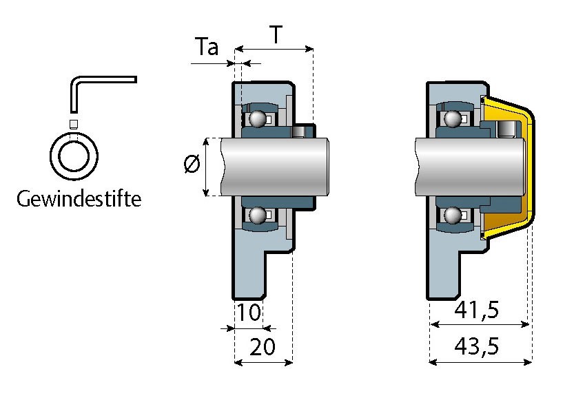 | Welle Ø | T | Ta | Lager Chromstahl Artikelbezeichnung | Lager Rostfreier Stahl Artikelbezeichnung | Separate geschlossene Sicherheits- kappe Teile-Nr. | Separate offene Sicher- heitskappe Teile-Nr. |