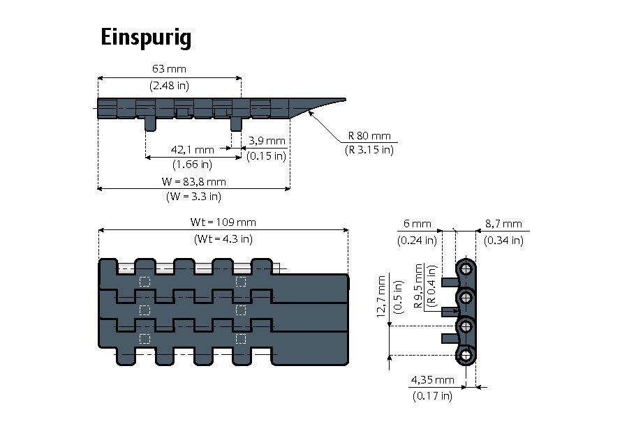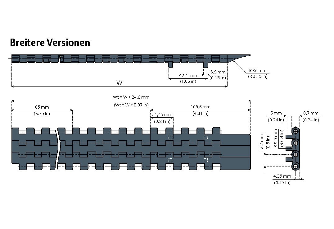 | Artikelbezeichnung | Material | Breite W | Teilung P | Rückbiegeradius | Max. Nutzlast | Gewicht | |||||