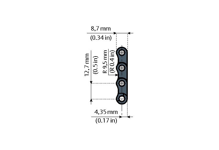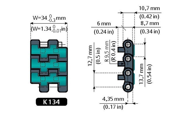 | Artikelbezeichnung | Material | Breite W | Teilung P | Rückbiegeradius | Max. Nutzlast | Gewicht | |||||