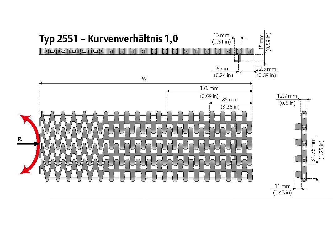 Breite WKurvengängig R. min.Max. NutzlastRückbiegung RadiusArtikelbezeichnung