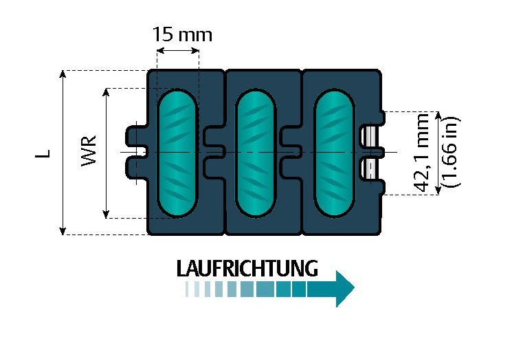 | Artikelbezeichnung | Material Platten | Material Gummi | Bruchlast N | Bruchlast lbs | Breite L mm | Breite L Zoll | Breite WR mm | Breite WR Zoll | Gewicht Kg/m | Gewicht lbs/ft. |