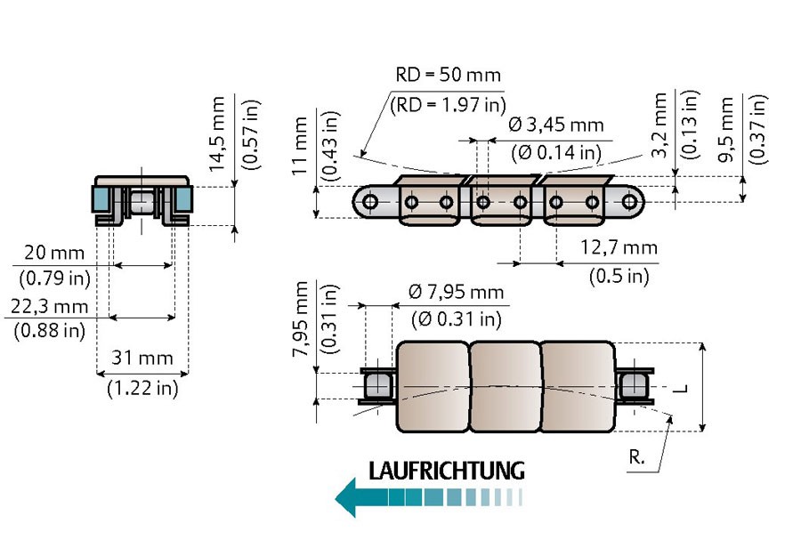 ArtikelbezeichnungMaterial RollenketteMaterial PlattenBruchlast NBruchlast lbsBreite L mmBreite L ZollR mmR ZollGewicht Kg/mGewicht lbs/ft.