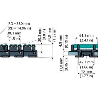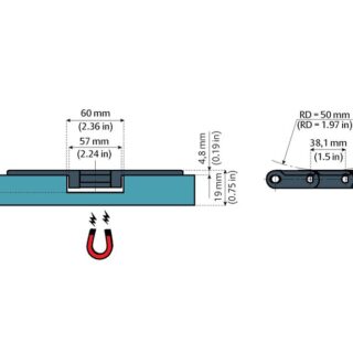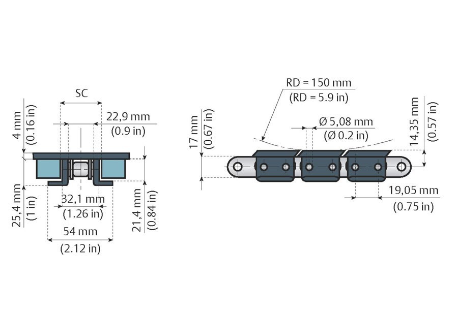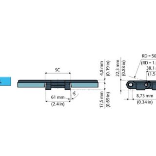 | Artikelbezeichnung | Material Rollenkette | Material Platten | Bruchlast N | Bruchlast lbs | Breite L mm | Breite L Zoll | R min. mm | R min. Zoll | SC Geradgängig mm | SC Geradgängig Zoll | SC Kurven mm | SC Kurven Zoll | Gewicht Kg/m | Gewicht lbs/ft. |