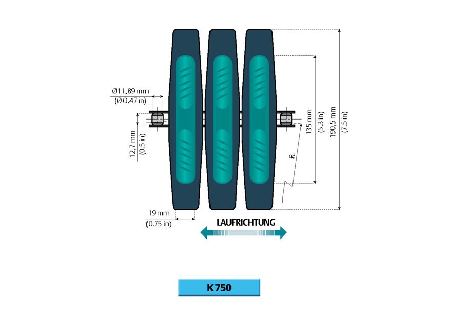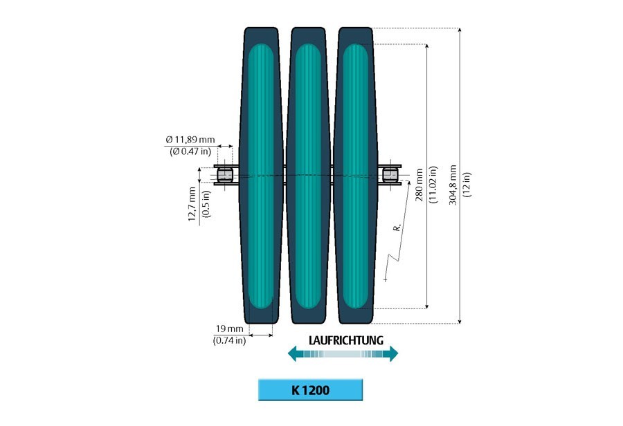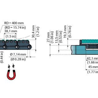 | Artikelbezeichnung | Material Rollenketten | Material Platten | Material Gummi | Bruchlast N | Bruchlast lbs | Breite L mm | Breite L Zoll | R min. mm | R min. Zoll | Gewicht Kg/m | Gewicht lbs/ft. |