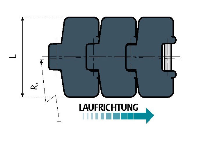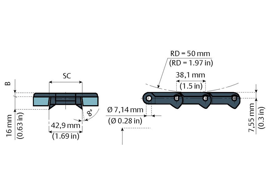 | Artikelbezeichnung | Platten material | Bolzen material | Bruchlast N | Bruchlast lbs | Breite L mm | Breite L Zoll | B Dicke mm | B Dicke Zoll | R min. mm | R min. Zoll | SC Geradgängig mm | SC Geradgängig Zoll | SC Kurven mm | SC Kurven Zoll | Gewicht Kg/m | Gewicht lbs/ft. |