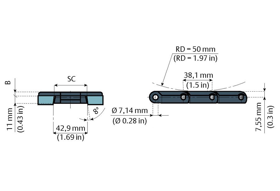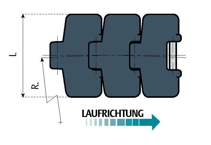 | Artikelbezeichnung | Platten- material | Bolzen material | Bruchlast N | Bruchlast lbs | Breite L mm | Breite L Zoll | B Dicke mm | B Dicke Zoll | R min. mm | R min. Zoll | SC Geradgängig mm | SC Geradgängig Zoll | SC Kurven mm | SC Kurven Zoll | Gewicht Kg/m | Gewicht lbs/ft. |