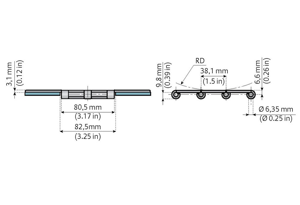 | Artikelbezeichnung | Material | Max. Betriebslast N | Max. Betriebslast lbs | Finish μm | Breite L mm | Breite L Zoll | G mm | G Zoll | RD mm | RD Zoll | Gewicht Kg/m | Gewicht lbs/ft. |