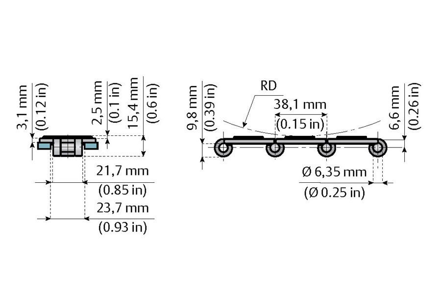 ArtikelbezeichnungMaterial KetteMaterial GummiMax. Betriebslast NMax. Betriebslast lbsBreite L mmBreite L ZollG mmG ZollRD mmRD ZollGewicht Kg/mGewicht lbs/ft.