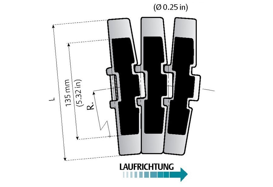 | Artikelbezeichnung | Material Kette | Material Gummi | Max. Betriebslast N | Max. Betriebslast lbs | Breite L mm | Breite L Zoll | R min. mm | R min. Zoll | Gewicht Kg/m | Gewicht lbs/ft. |