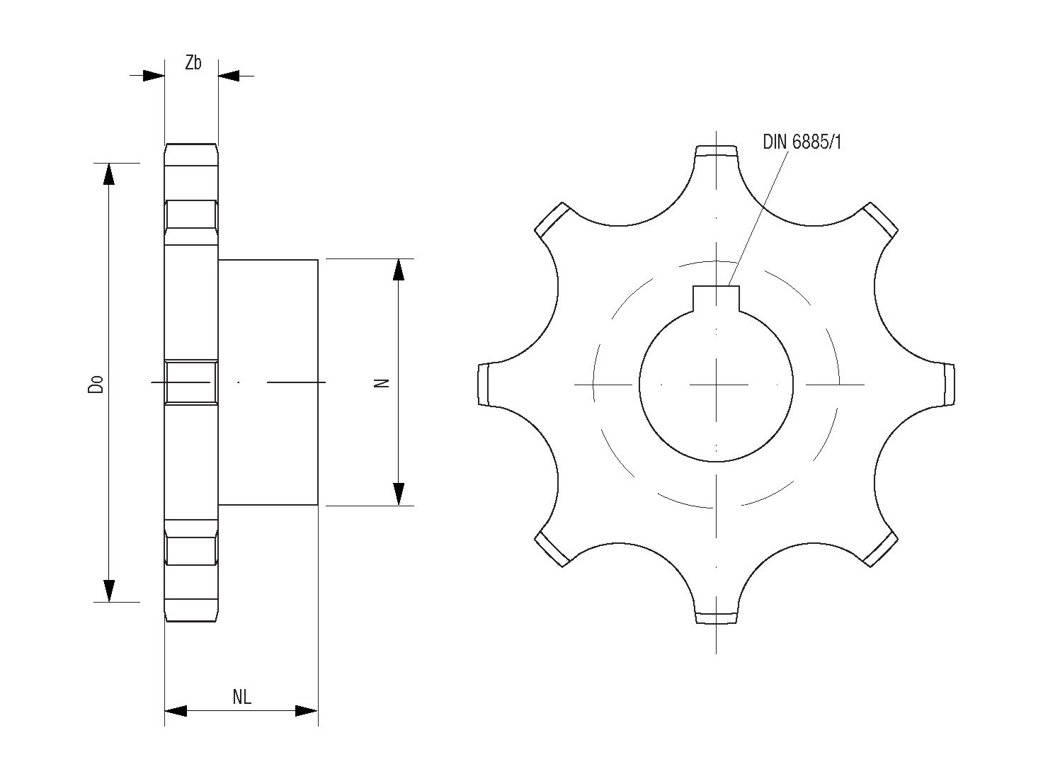 | P mm | z | Do Ø mm | N Ø mm | NL mm | Zb mm | Zahnform | Bohrung Ø mm | Nut |