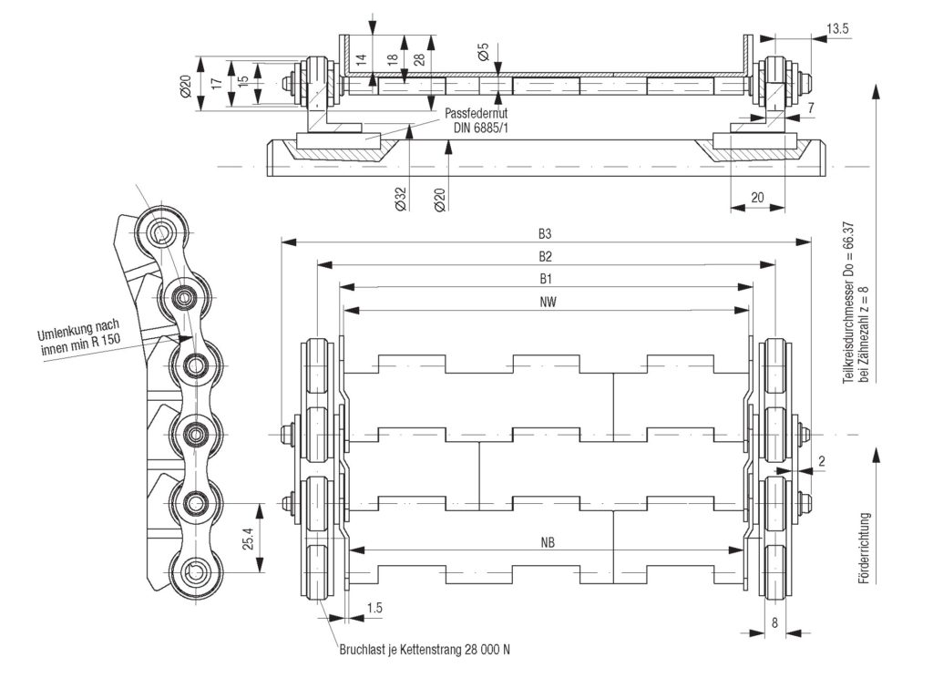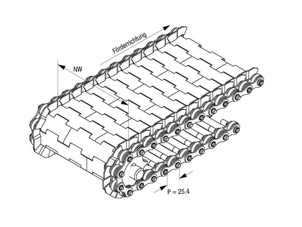 | NW mm Nennweite | NB mm Nutzbreite | B1 mm Äussere Breite | B2 mm Kettenmittenabstand | B3 mm Max, Gesamtbreite | Gewicht kg per lfm |